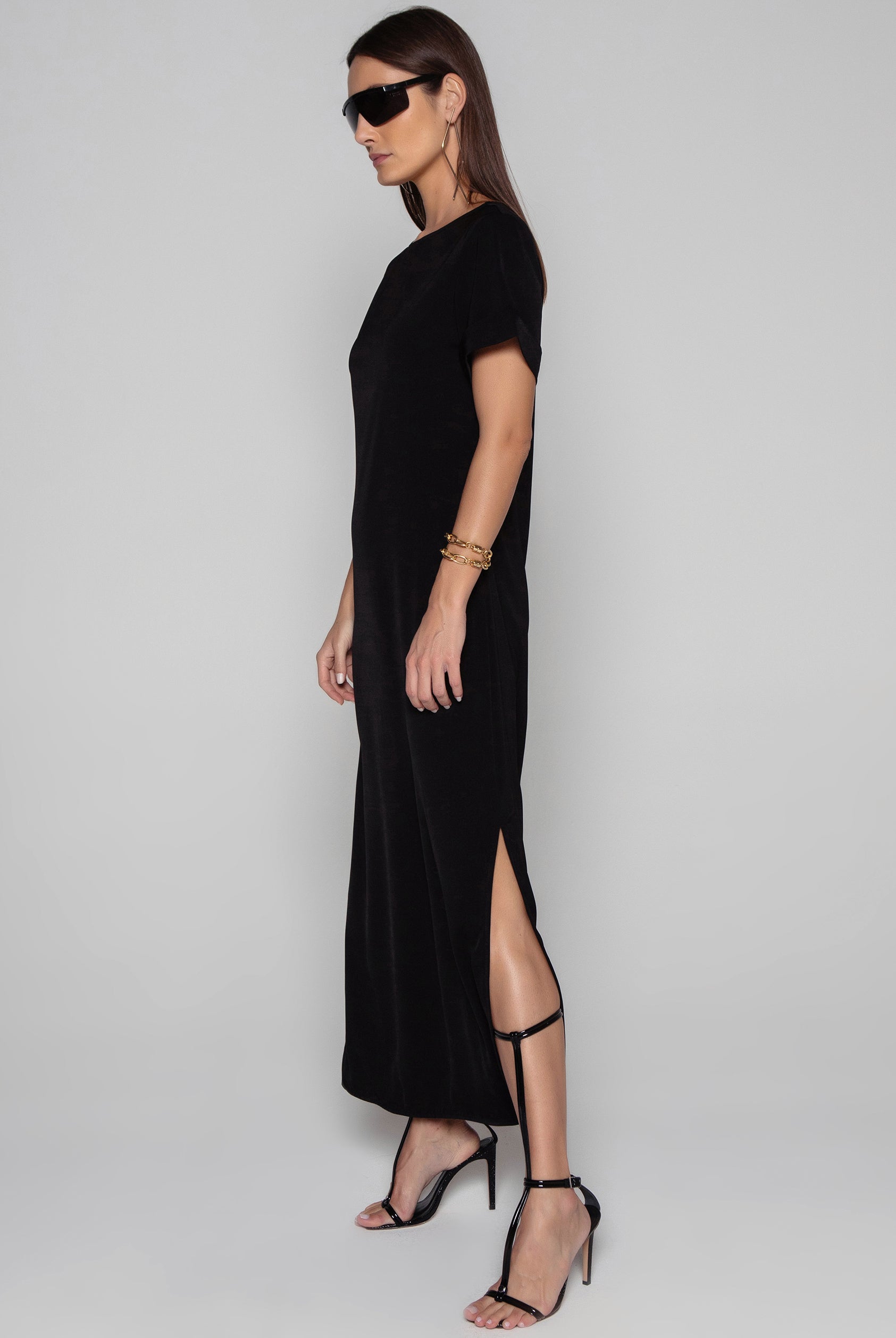O vestido longo super confortável possui modelagem ampla e fendas nas laterais. Peça versátil e atemporal, tecido leve e fluido. Fechamento nas costas em zíper invisível.